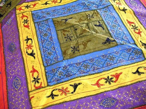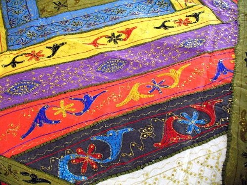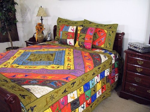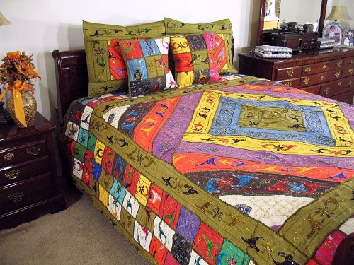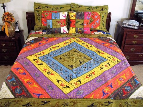 A dazzling, brilliant Bedspread set that is guaranteed to leave you spellbound! A range of splendid vibrant hues harmoniously brought together using Khaki. Here's a gorgeous & intricate 5 pc Cal King / King / Queen Bedspread set that represents the most spectacular forms of workmanship & skill. An amazing collage of Zardozi* work, beads, discs, metallic wires, Sequins & what not, this kaleidoscope of colors is a visual delight. Patches from antique wedding saris and textiles from India have been harmoniously brought together to create this masterpiece. As you would expect, the combination produces a sight that you would marvel at for hours. This exquisite hand made 5 PC set is a collector's delight. This set comes to you from the city of Jaipur in Northern India. Sequin work is in Copper, Gold and Silver. Each of the patches are adorned with extensive patterns of sequins, beads, discs & Zardozi work! The Bedding Set consists of a fully lined bedspread, 2 Pillow Covers and 2 Cushion covers. The other side of entire bedspread is lined with Khaki cotton lining that protects the intricate sequin & bead work. The Pillow Shams and cushion covers are lined with similar cotton lining too and have zippers or overlapping slats to put the pillow or insert in. Brighten your bedroom & transform your bed with the royal grandeur of Indian culture. Go for a dramatic makeover of your bed and this bedspread & pillow cover set would become a conversational piece of art. This bedspread is a perfect blend of luxurious style & enriching beauty.